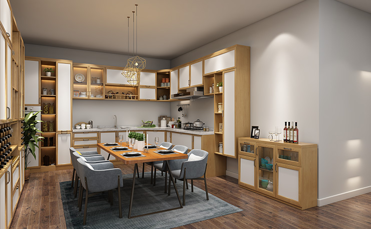 此矮斗柜設(shè)計,以存儲碗具為主要目的,在設(shè)計風(fēng)格上和整體櫥柜連接,也起到了裝飾性的效果。柜體高低對比之下,也顯現(xiàn)出家裝的設(shè)計之感。