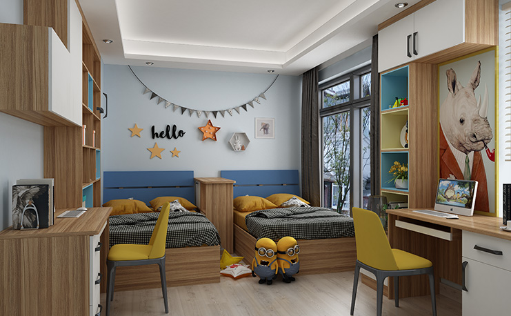 此戶型為雙人居住,兩個(gè)書桌組合柜分列兩側(cè),書柜依墻壁建造,既減少了橫向空間,同時(shí)還擴(kuò)大了櫥柜的存儲(chǔ)空間;同時(shí)兩側(cè)書柜擺放空間都交錯(cuò)而行,增加了不少的設(shè)計(jì)感。