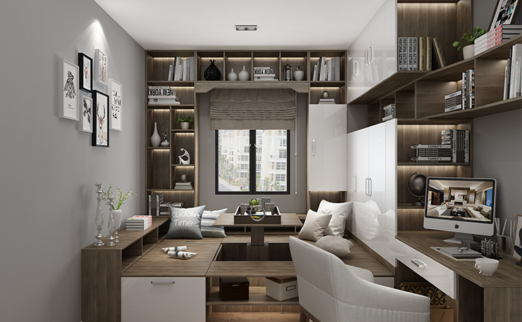 該步入式榻榻米以深色調(diào)木材搭配白色板材,突出時(shí)尚風(fēng)格;依靠窗臺(tái)墻面增設(shè)裝飾柜,既起到了裝飾的作用,同時(shí)還可收納物品;吊柜錯(cuò)落穿插,都市風(fēng)格十足。