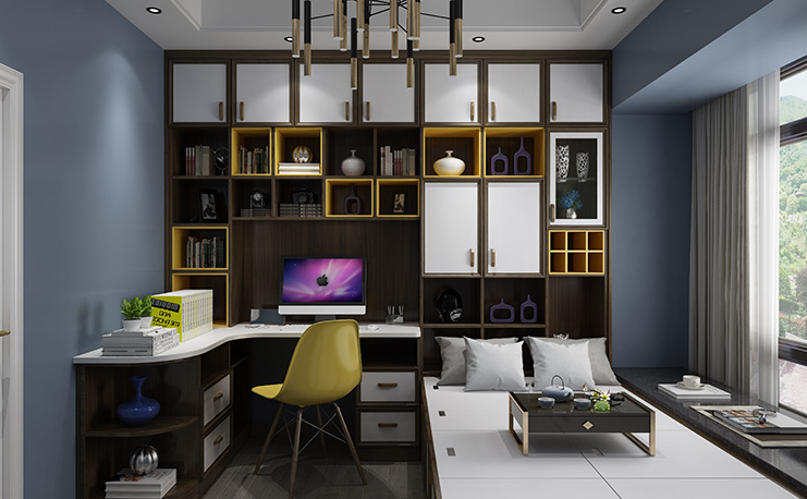 飄窗榻榻米延伸窗臺(tái)更大空間,采用現(xiàn)代設(shè)計(jì)風(fēng)格,將各類(lèi)設(shè)計(jì)元素結(jié)合;柜體主色調(diào)深沉穩(wěn)重,以橙黃色點(diǎn)綴,更顯活潑之感。